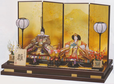 高さのある金箔屏風に描かれた、富士と桜吹雪がいっそう豪華な雰囲気の雛飾りです。