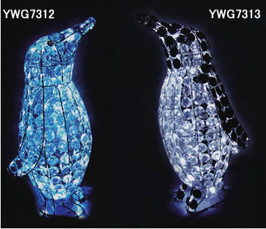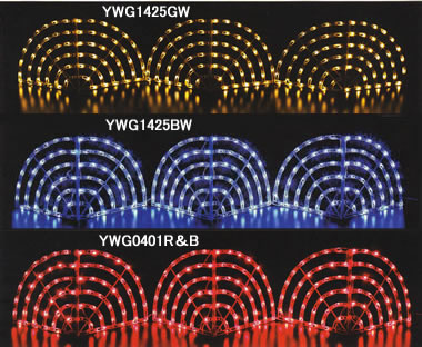 アクリルのローズと葉にLEDの光が反射して、素敵なイルミネーションをお楽しみいただけるアーチです。店舗の入り口や、お家の玄関に簡単に設置していただけます。どのタイプも葉のLEDは常灯で、ローズ部分のみYWG2407RE/2408は、ICコントローラーで8パターンの点滅方式がお選びいただけます。YWG2407MUのローズ部分は、自動で点滅しながら色の変化を繰り返します。(防滴仕様)